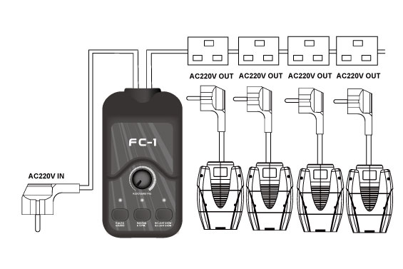 Fly system was born to simplify the control of small effect lights. No more need of using DMX system for operation, nor complicated cable engineering. Using Fly system, signal cable is no more necessary between the lights. Only general sockets are required for the installation. The secret is that the power source of all lights and the Fly controller must be of a same switch, and the Fly controller must be installed in front of the switch.