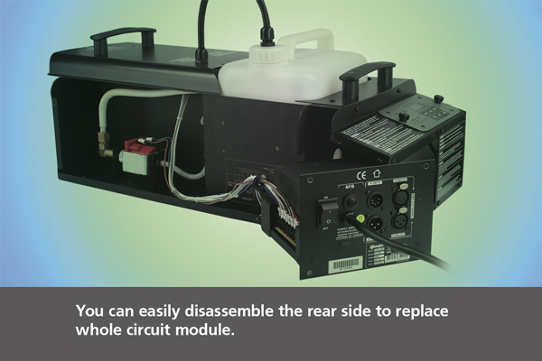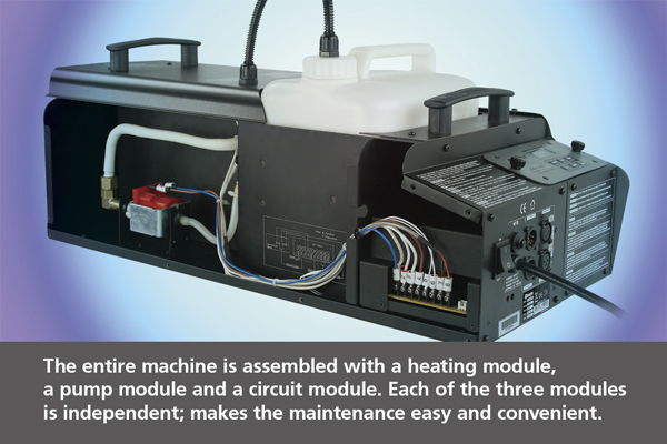 Super-powerful GT-3500 creates spectacular effects without making any noise. The innovative oil providing system performs vaporizing process through one-piece jointless die-case heating module and as a result, reduces the possibility of nozzle blockage to minimum. Even when emitting continuously as large volume as 50,000 cu.ft/min, the fogger still works in perfect order. Use our non-toxic high-quality water-based liquid to maximize the fogging effect, and you can relax and enjoy the stage performance.